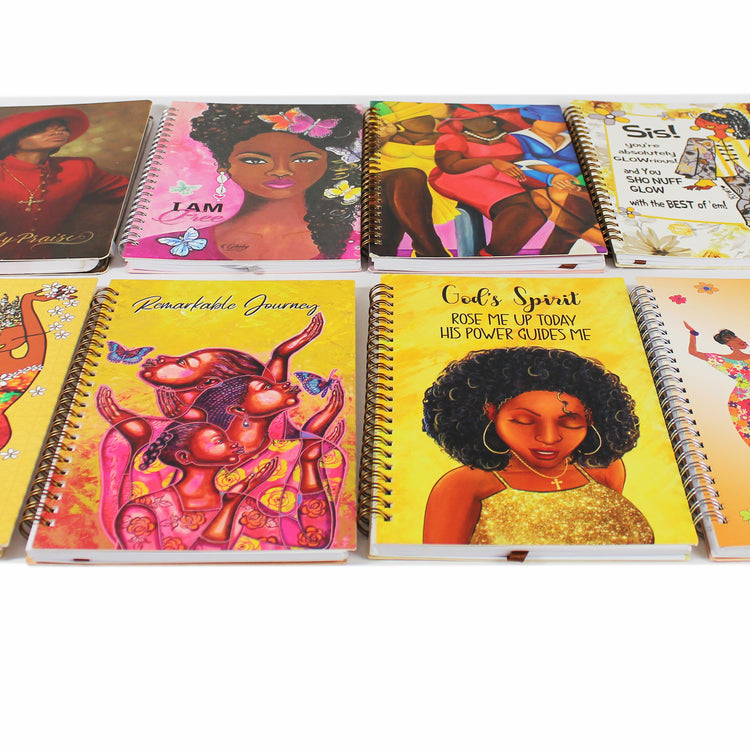 African American Journals are a unique Black Gift item available in a variety of styles! Our Journals come in an attractive variety of sizes and formats - including traditional and wire spiral bound. They all feature with plenty of pages to write down your ideas, goals, memories and daily affirmations. Shop inspirational cover art work by Black Artists like Annie Lee, Henry Lee Battle, Larry Poncho Brown, Gbaby, Kiwi McDowell, and Cidne Wallace.
