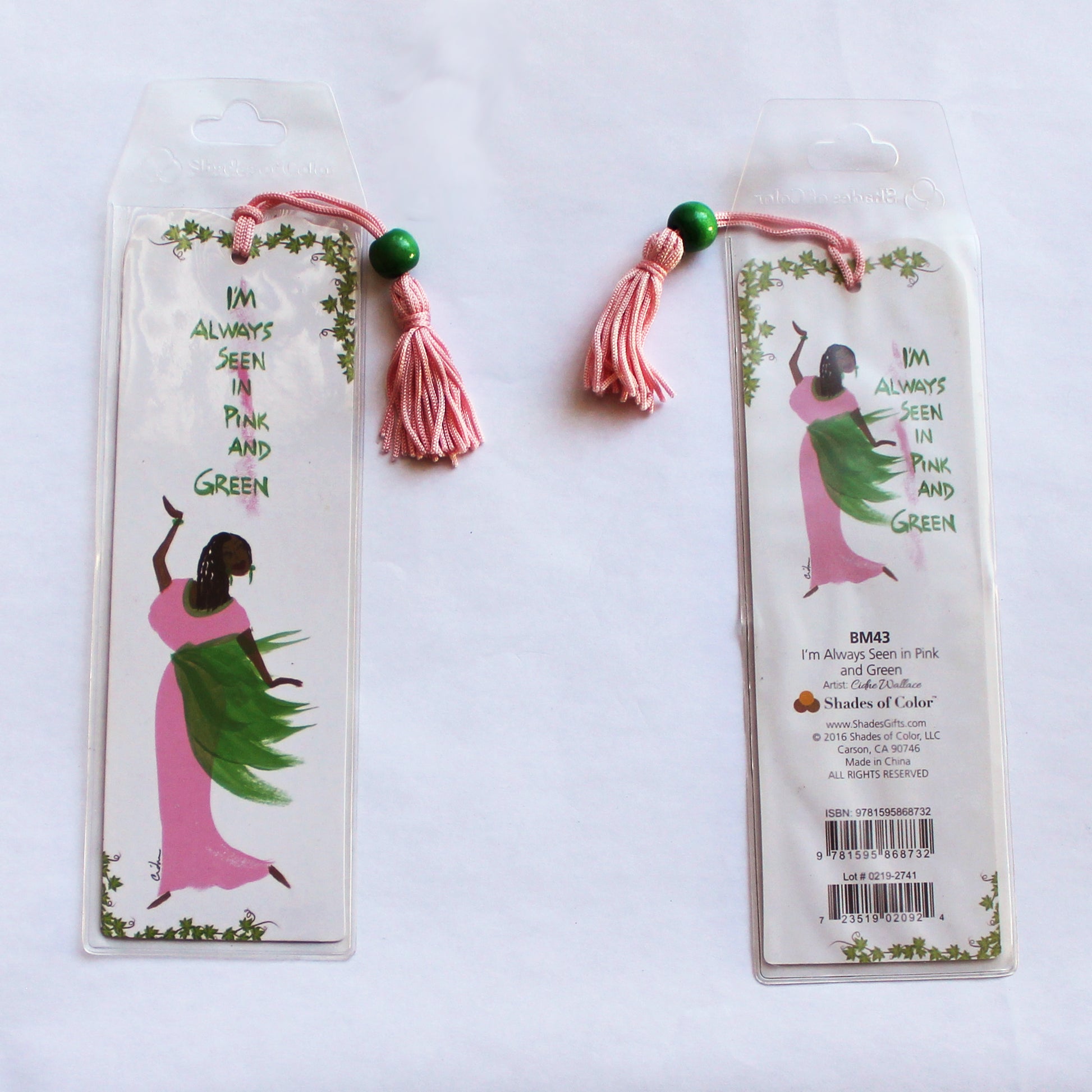 Keep place in your favorite book and celebrate your sorority with this sturdy bookmark. Featuring African American art from Cidne Wallace, this pink and green themed bookmark is adorned with a beaded tassel and protected by a clear plastic sleeve.