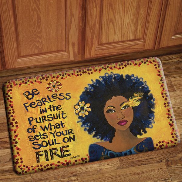 A brand new line of designer African American Interior Floor Mats - floor art for multipurpose use! Featuring genuine artwork from your favorite artist, Sylvia Gbaby Cohen, that will uplift and inspire your home. This unique design for any area of your home, school, dorms, or business. Ideal Home Decor item for indoor entrance, kitchen, bathroom, etc. Made with polyester on top and finished with a rubber backing to keep the mat in place and to prevent slipping. Extremely light weight. Hand wash only.
