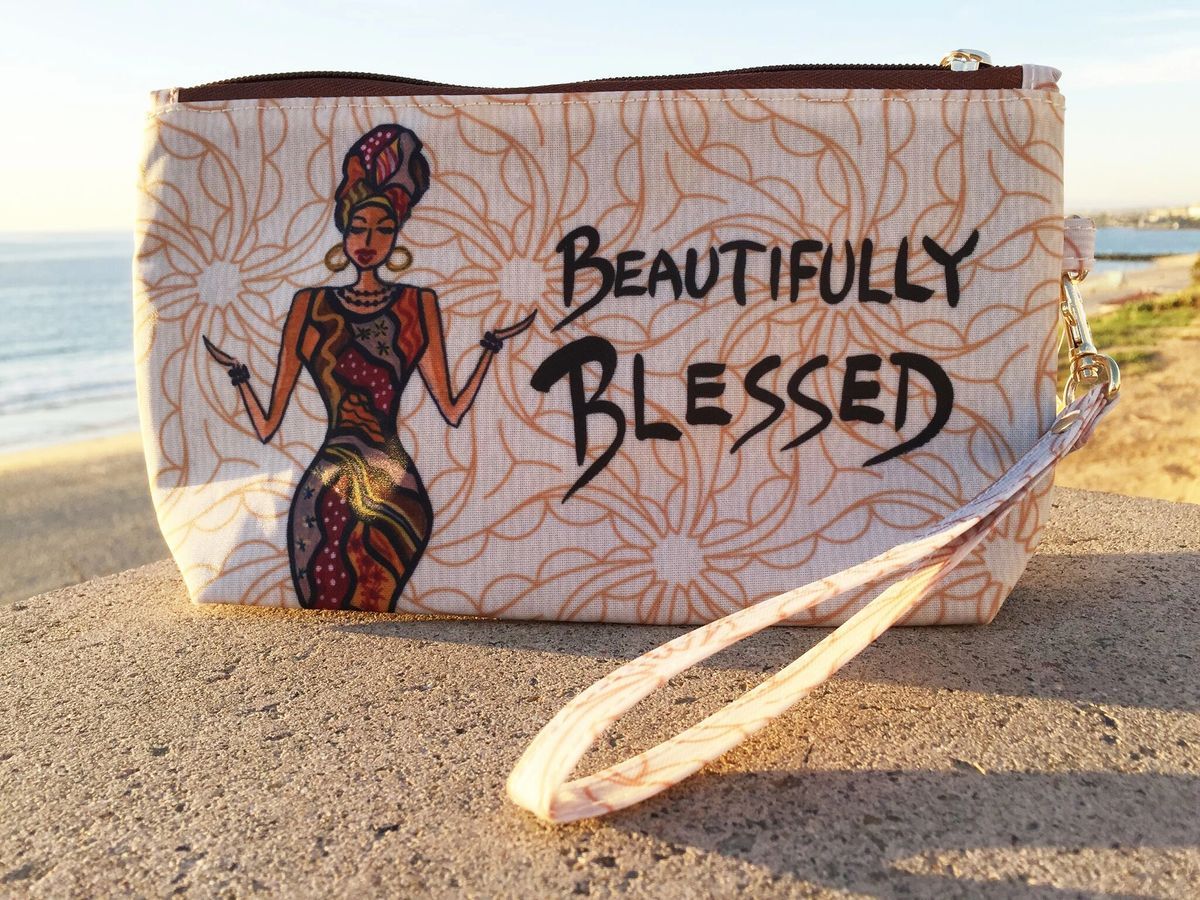 Brand new Cosmetic Pouches are a must have for carrying on the go. Perfect size for mascara, lipstick, makeup, pens, pencils, sunglasses, and other small items. Featuring Black Art from your favorite African American artists. Made from water resistant material, these pouches act as fashionable storage bags that are durable and attractive for home, work, school, gym or travel. Deigned to meet your everyday needs! Includes zipper closure and matching wristlet. Size: 9 x 2 x 5