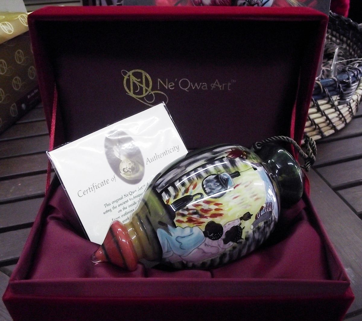 This lovely black art glass ornament is designed by Annie Lee. It is hand-painted using the centuries-old tradition of painting on the inside of mouth-blown glass Ne'Qwa is a Chinese term for painting on the inside of the glass. The ancient technique of reverse hand-painting on the inside of mouth-blown glass is used. From outlining to shading to color application, all work is painstakingly done in freehand. Each piece is unique.
