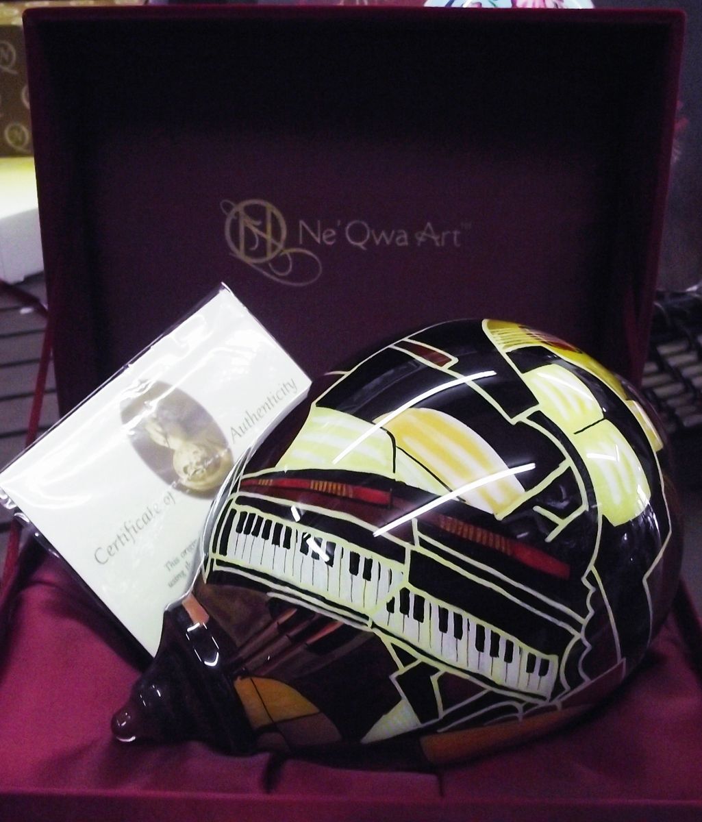 "Music" by artist Paul Brent is presented in its own hand-made silk damask-lined velvet box. The ornament is hand-painted on the inside through the small opening at the top! All ornaments are made from high-quality mouth-blown glass and branded with the Ne'Qwa Art insignia. Comes brand new in the box.